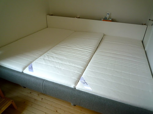 Her har madrassene også kommet på plass - relativt billige sådan, polyetermadrasser fra Ikea. Men imponerende gode, særlig med den fancy ribbebunnen under.